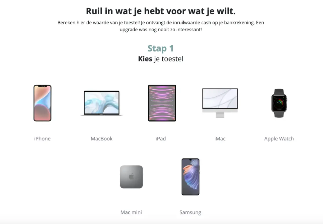 Met onze Trade-in module bieden we jullie medewerkers een eenvoudige manier om oude smartphones, laptops of tablets in te ruilen voor een financiële vergoeding.